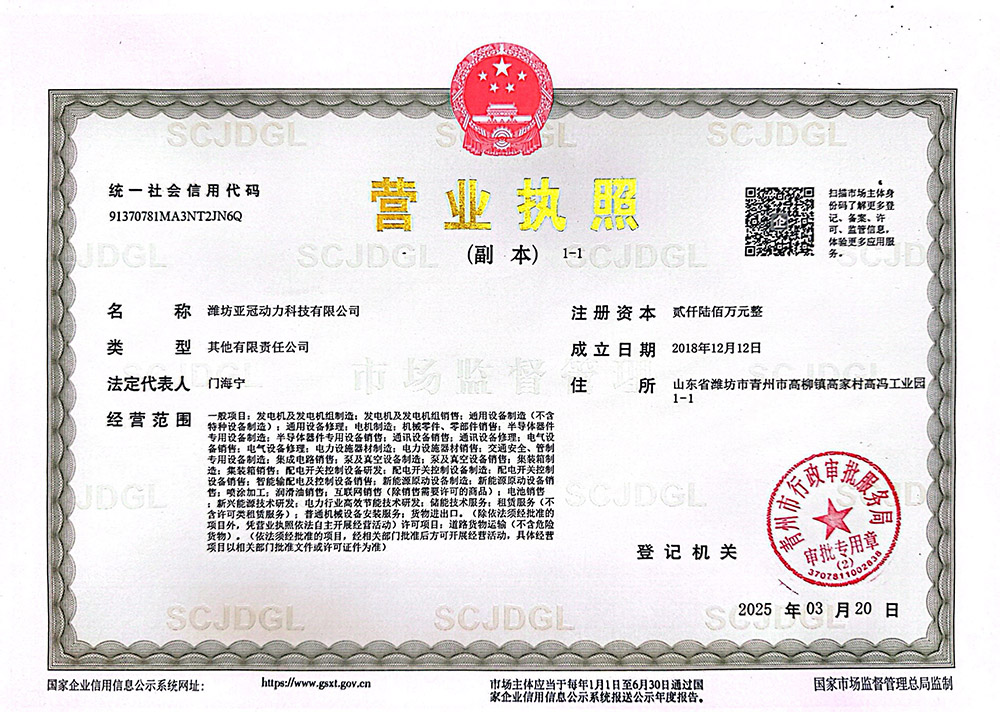 潍坊亚冠动力科技有限公司通过不断的创新和努力,与各大知名品牌电机和柴油机厂商达成了长期的合作伙伴关系,获取了各大配套供应商的授权证书。产品在实际使用中获得了广大客户的一致好评! 亚冠动力24小时订购服务热线:13563600772。亚冠动力始终把客户放在首位,“以诚待人,客户至上”而且“设计-销售-售后” 一站式服务,值得您的信赖。此外,我们还为您提供量身定制的解决方案,一年365天,每周7天,每天24小时不间断服务和支持。
